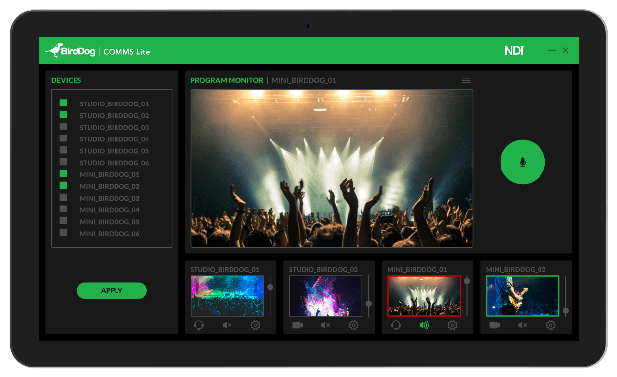 Sfruttando la vera potenza NDI, BirdDog Comms è il primo sistema di interfono audio al mondo che integra i feed delle telecamere live.