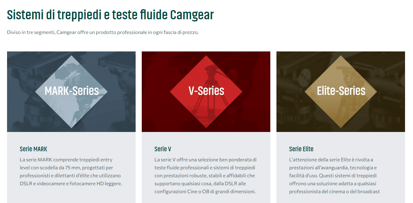 Le fluid heads e i sistemi trypod di Camgear sono rinomati in tutto il mondo per ottenere movimenti di trascinamento fluidi e precisi, un’elegante architettura ergonomica, sistemi di controbilanciamento accurati e prestazioni affidabili.
