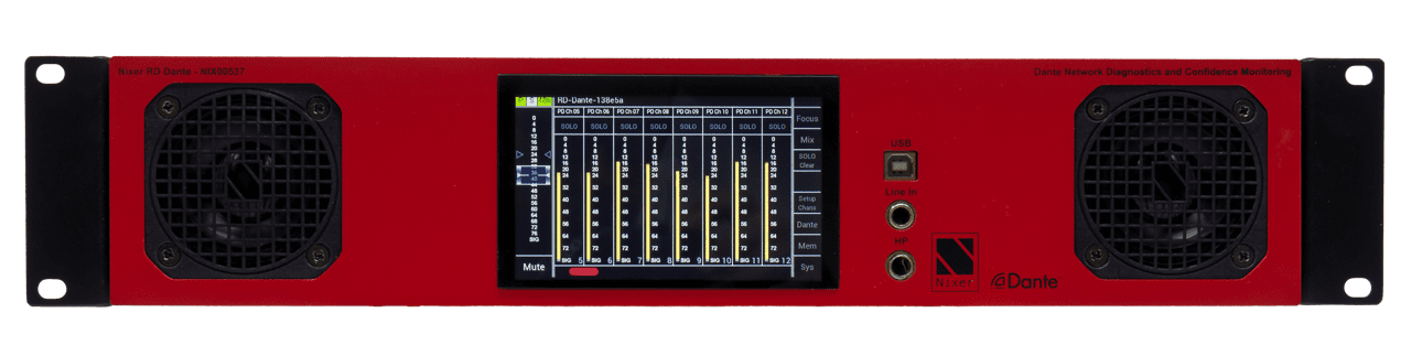 Monitor Dante a 64 canali montato su rack 2U – con 2 amplificatori da 25 W, altoparlanti con porta da 63,5 mm, doppio alimentatore ridondante, connettori di rete ridondanti, compatibilità AES67, uscite di linea stereo (2 x 3 pin XLR maschio), ingresso AES (3 pin XLR femmina), uscita AES (XLR maschio a 3 pin).