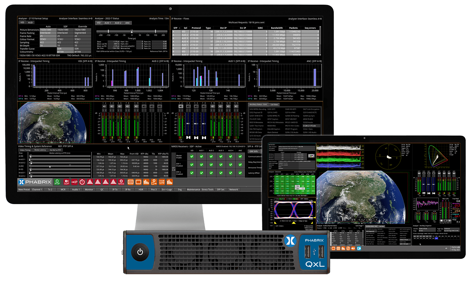 Per flussi di lavoro IP UHD in tempo reale su reti 25G con payload video fino a 21 Gbps, QxL, leader della categoria fornisce supporto per ST 2110 e 2022-6 su interfacce generiche SFP28 10G/25G. Supporto per formati UHD/4K sia per IP che SDI, inclusi formati in modalità estesa HD/2K, PCAP, IP Measure e formati in modalità estesa UHD 2110 (YCbCr/RGB 444, 8/10/12 bit; da 48 a 60 Hz), possono essere aggiunte anche come licenze opzionali. Un’opzione hardware SDI Eye e Jitter e l’esclusivo set di strumenti SDI-STRESS forniscono tutti gli strumenti per l’analisi del livello fisico SDI e i test di conformità.