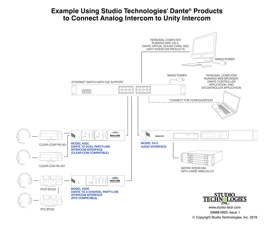 L’interfaccia audio modello 44D di Studio Technologies è concepita per essere utilizzata per collegare due canali intercom analogici a 4 fili a una rete Dante. L’interfaccia audio modello 5412-01 di Studio Technologies può essere utilizzata per collegare otto canali di interfono a 4 fili.
