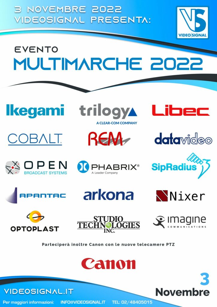 In data 12 e 13 novembre 2015 avrà luogo a Roma c/o NH LEONARDO DA VINCI in Via dei Gracchi, 324 l’attesa open house di VIDEO SIGNAL S.R.L., l’Evento Multimarche, dove saranno presenti ed esposti i seguenti marchi pronti ad illustrare le ...